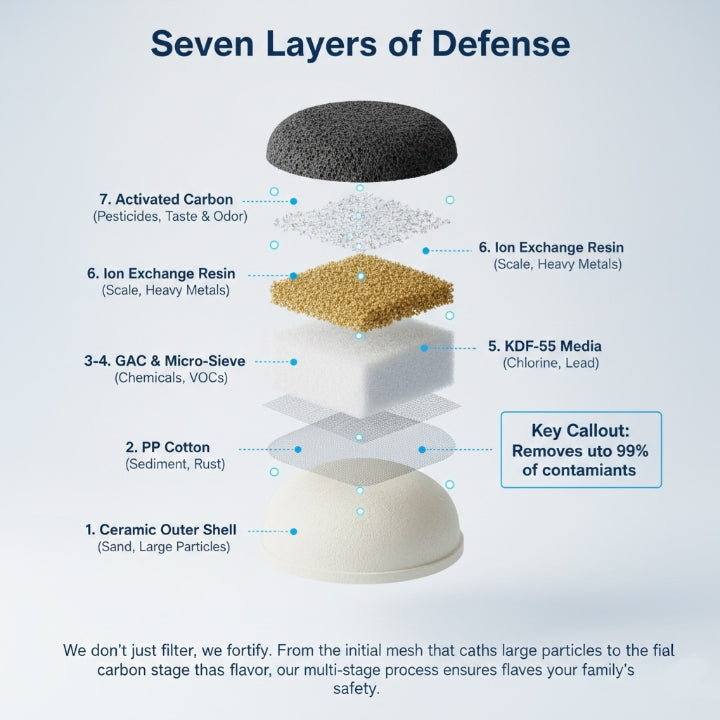 From the ceramic outer shell that catches rust to the activated carbon that polishes the flavor, our multi-stage process ensures your family’s safety.